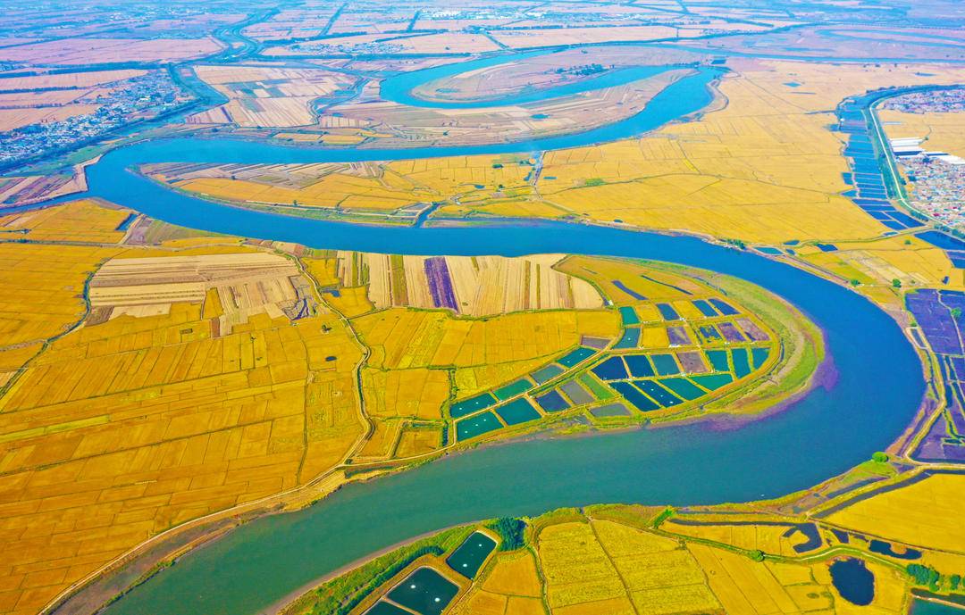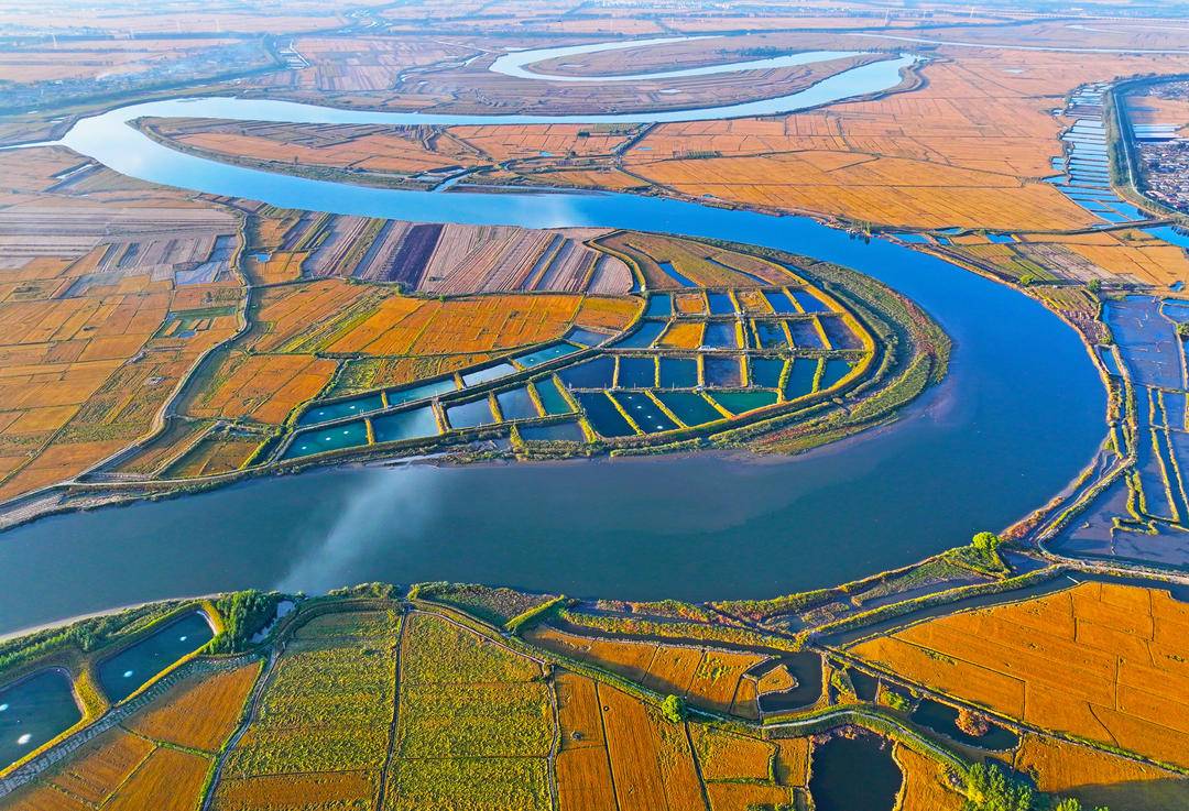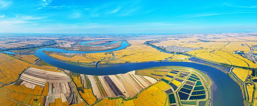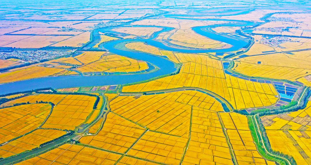眼下、遼寧地域の稲作は成熟期から収穫期を迎え、秋の気配が大地を黄金に染めている。盤錦市大洼区東風鎮周辺では、空中から眺める遼河湿地の大湾曲が広がる。遼河の水は紺碧のインクが金色の稲田の間を蜿蜒と流れるが如く、さらに母の乳のように豊かに両岸の作物と人々を育んでいる。実り豊かな田園、起伏する畑、整然とした集落が、豊穣の錦絵を織りなしている。