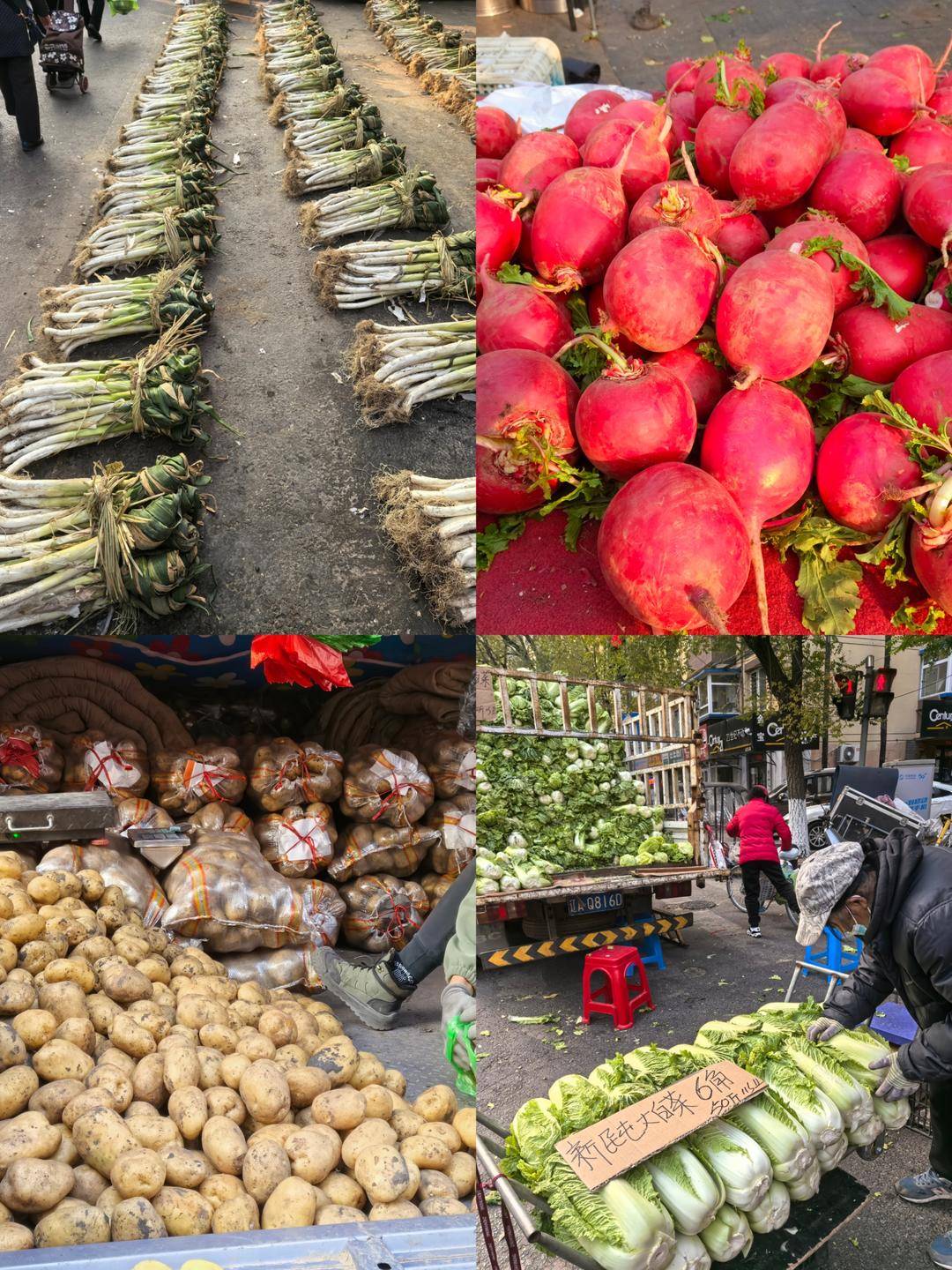 この季節、朝市で最も活気のある光景は秋野菜の大群である。車両一杯の白菜が真白でふっくらと整えられ購入を待ち、結束された長ネギが整然と列を成し持ち帰られるのを期待し、地面一面に転がる大根は貴方について帰宅したくてたまらず、ジャガイモは山積みになって前方に押し寄せる。これらの秋の収穫物は農地から都市部へ運び込まれ、それらは「愛らしく美味で、質素かつ経済的」なのである。