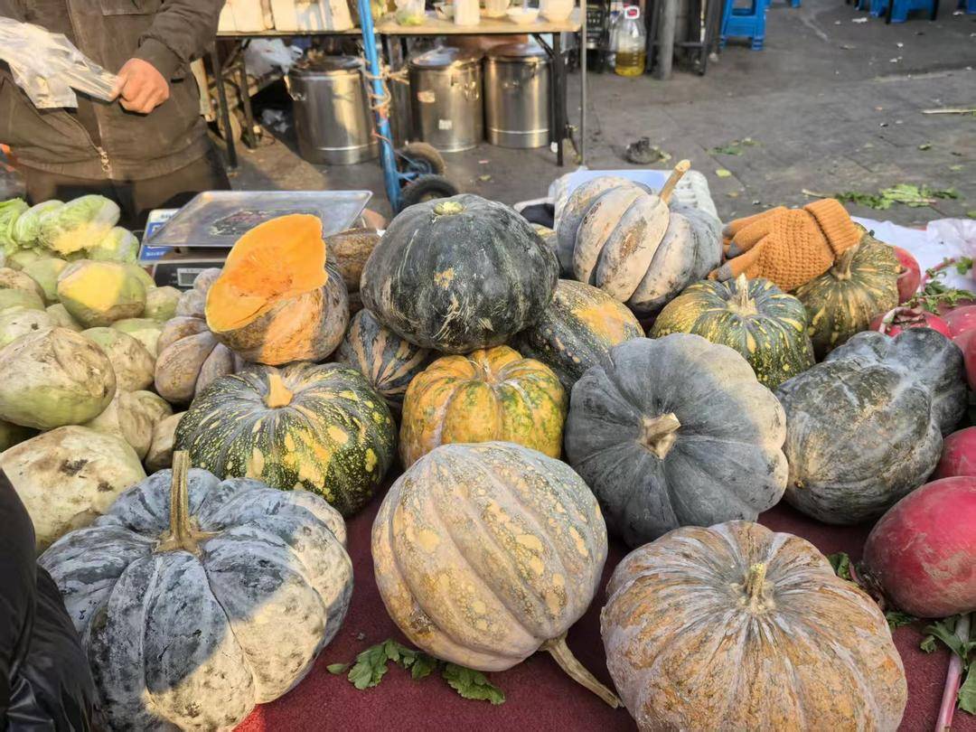 倭瓜(カボチャ):学名を方瓜と称し、長円状及び球状の形態が存在する。野菜店の「常駐メンバー」であり、野菜としても主食としても機能し、調理法が多様で保存性に優れる。現在では多くの若年層が倭瓜を購入し、ジャック・オー・ランタンを制作して装饰品とする例が見られる。