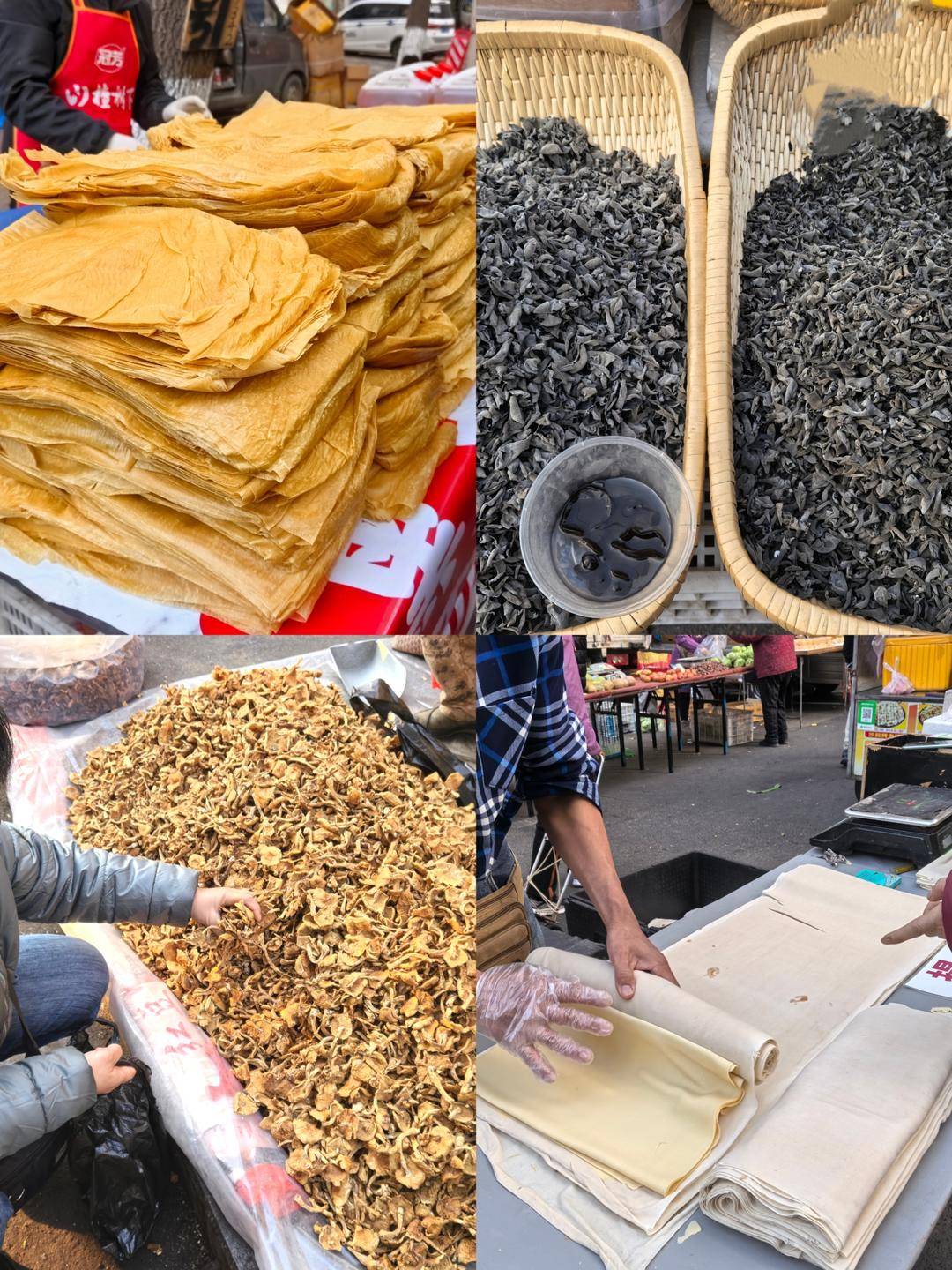 豆腐皮(湯葉):朝市の農家が自家製造する湯葉は、生活の息吹に隠れた「生鮮品」である。大豆本来の清香を帯び、市販品より厚手で豆の風味が強く、秋冬の煮込み料理や和え物に適した食材である。