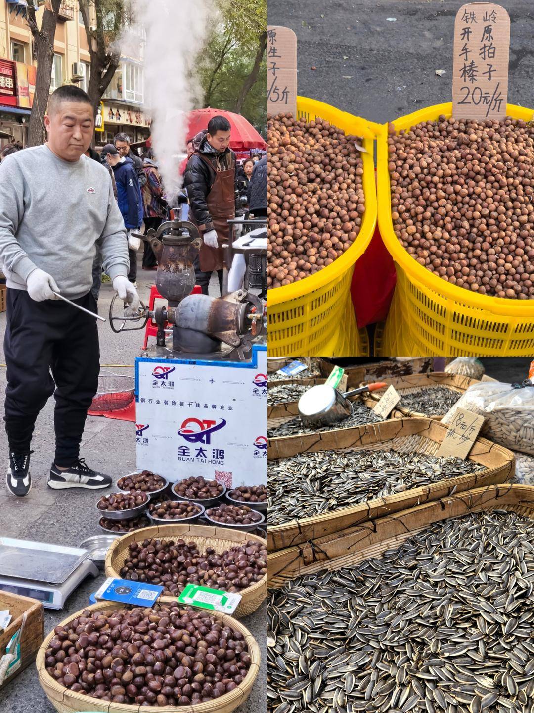 「パン」という破裂音と共に湯気が立ち上り、鍋一杯の栗が炒り上がる。皮は薄く果肉は大きく、柔らかくてもちもちして甘味が鮮烈である。朝市特有の炒り栗は20元一鍋、実に絶品である。炒り栗、ハシバミの実、ヒマワリの種は北方の秋冬を代表する「ナッツ三巨頭」であり、いずれも欠かすことができない。