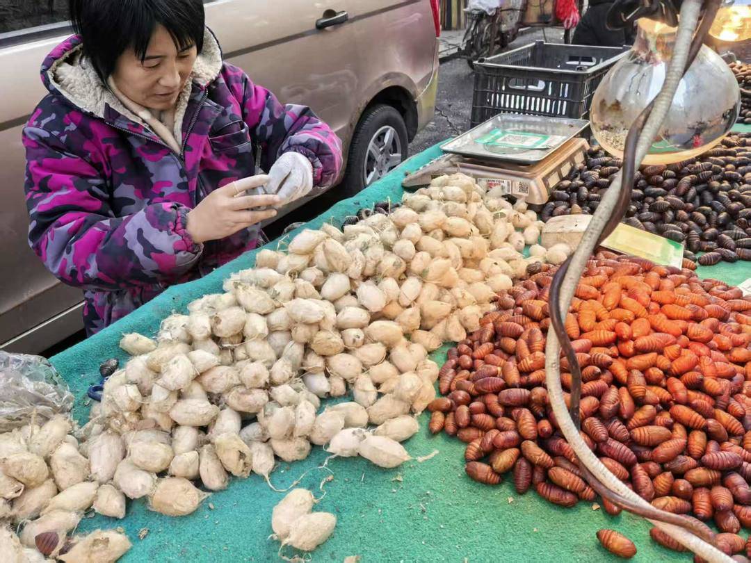 柞蚕(さくさん)の繭:早朝に「寝床」から引き摟り出された繭や蛹を見たことがあるか。北方の朝市では繭蛹がこのようにその場で剥きながら販売されるのである。これは北方特有の柞蚕の繭であり、秋になると野生の柞蚕幼虫がナラの木に形成する繭殻である。故に北方では秋季に山へ「秋繭を採りに行く」という言説が存在する。