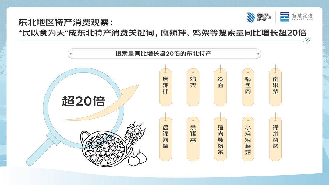 京東の消費データも東北美食の人気を裏付けており、ここ1ヶ月で「麻辣拌、鶏ガラ、鍋包肉」などの特色ある軽食の検索数は前年同期比20倍以上増加した。