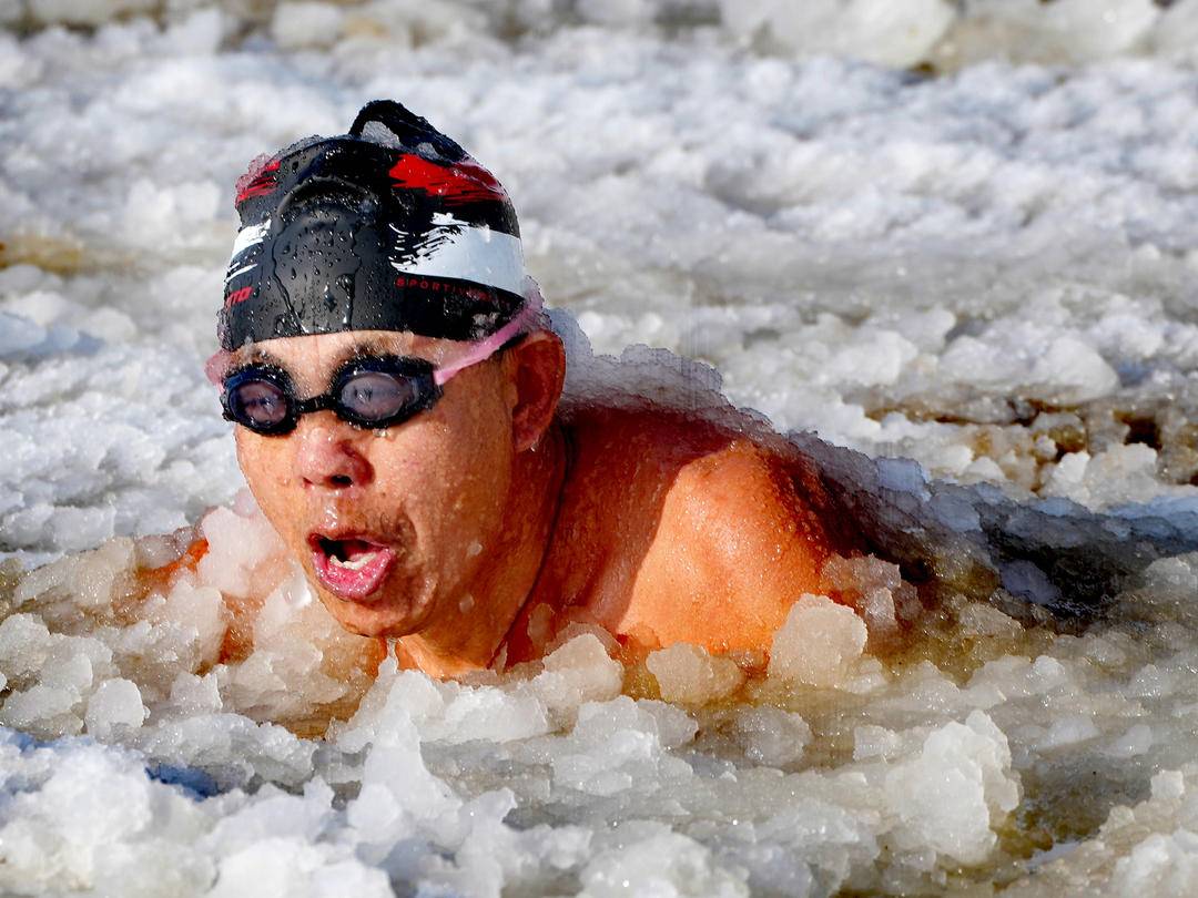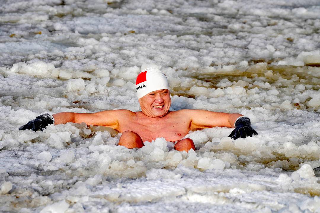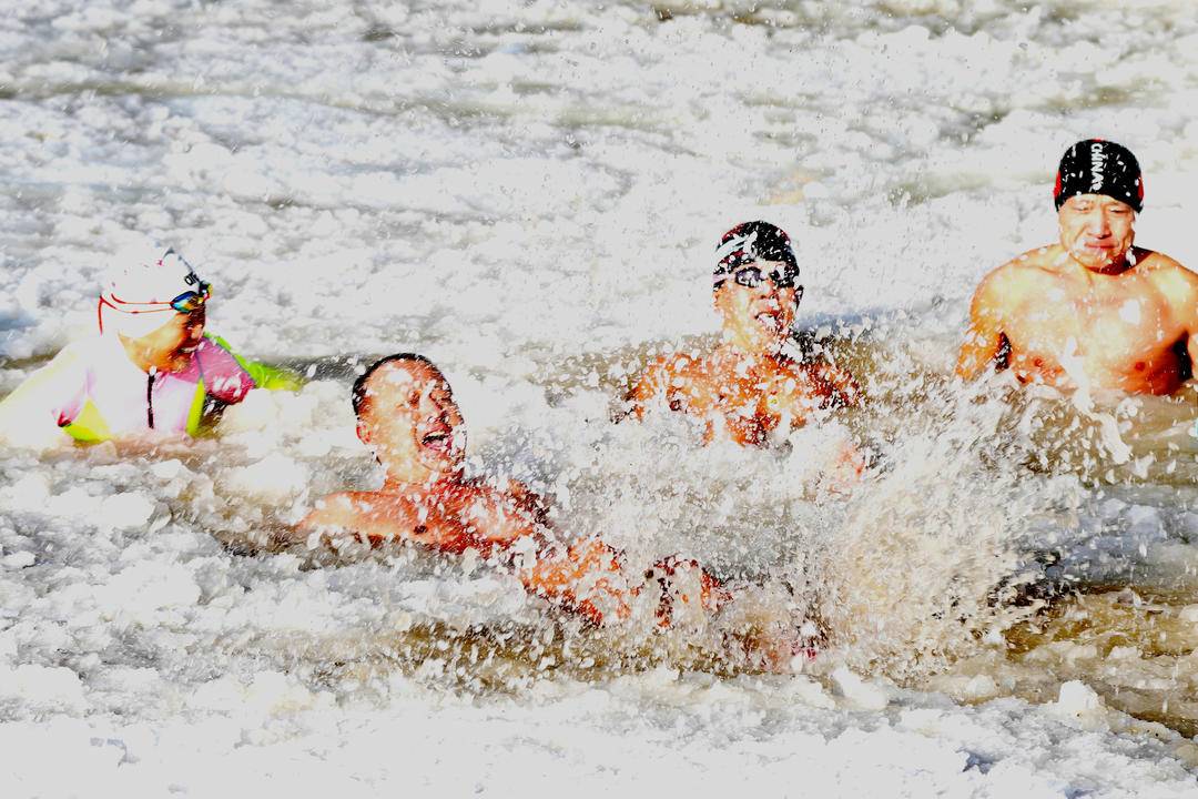 海岸の浅瀬には所々に氷塊が浮かび、冬泳愛好家たちは準備を整えると、氷と海水が入り混じる区域でウォーミングアップをし、水に入っていく。彼らは氷の混じった波の中で思い切り泳いだり、浮氷の上でユニークなポーズをとったりし、跳ね上げる水しぶきと周囲の雪氷が互いに映え合う中、寒風の中でも生き生きと輝く笑顔を見せている。中にはベテランの冬泳愛好家もおり、「極寒期の冬泳ぎは毎年欠かさず挑戦する行事で、体力を鍛えられるだけでなく、鮁魚圏の冬の海岸ならではの魅力も感じられる」と語る。