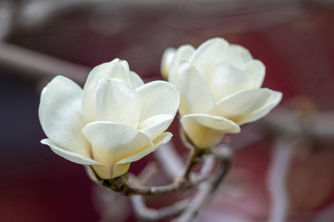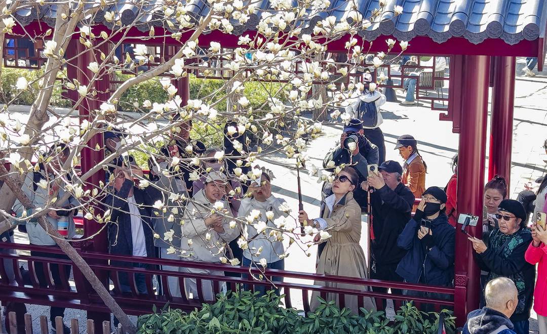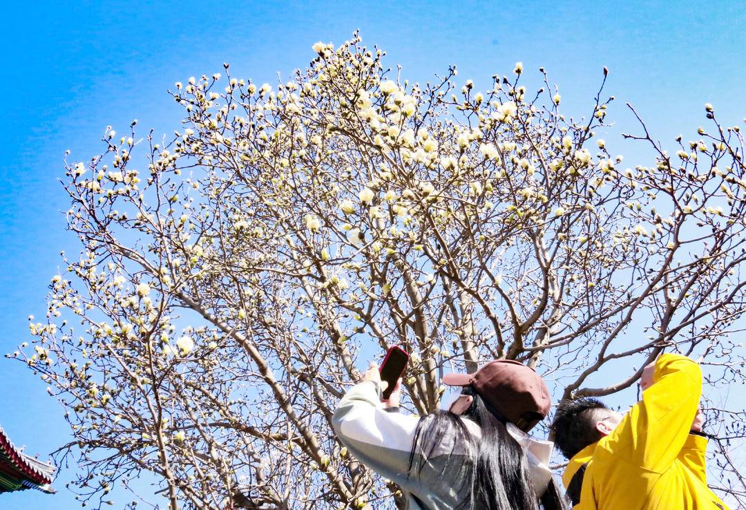暖かな日差しの下、白いハクモクレンは清楚で気品があり、花びらはまるで玉を彫り刻んだかのように純白で無垢。赤いハクモクレンは華やかで鮮やか、優美な姿を見せ、赤と白のコントラストが春の活気を一層引き立てている。ハクモクレンの香りが風に乗って漂い、市民の足を止めさせ、写真を撮って思い出に残す人々で賑わっている。