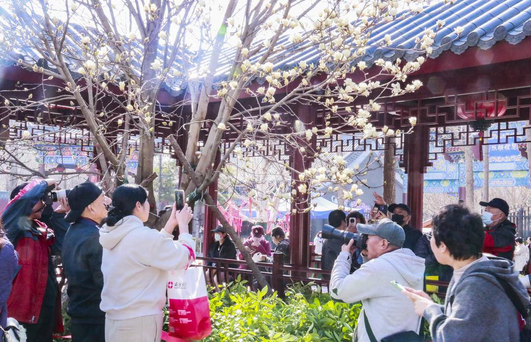 3月31日、瀋陽市大東区の東塔園ではハクモクレンが満開を迎え、赤と白の花が競うように咲き誇り、春の近郊花見スポットとして最適な場所となっている。