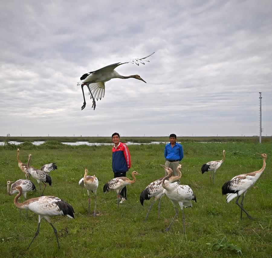 市は2012年、湿地保護区内にタンチョウ種源繁殖基地を設立した。趙さんら専門スタッフの努力により、同市のタンチョウの人工繁殖技術は成熟を続け、繁殖数も年々増加している。25年、人工繁殖されたタンチョウは89羽となった。