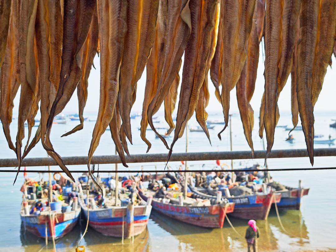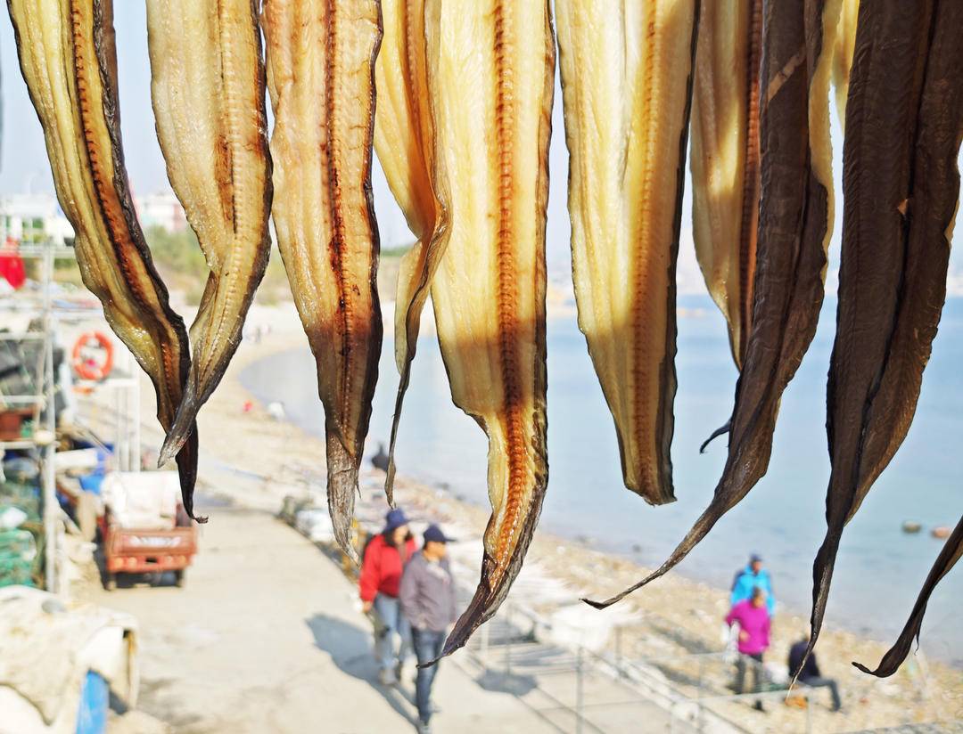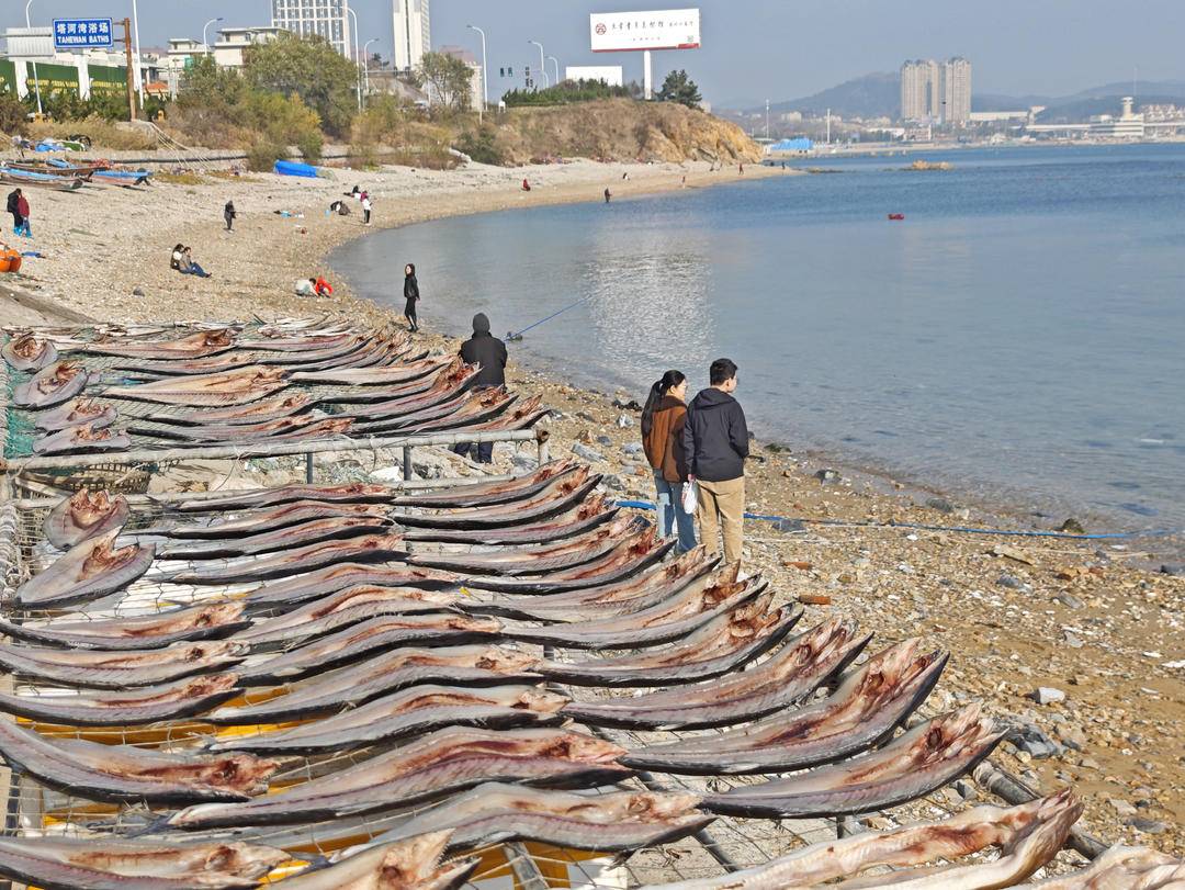 初冬を迎え、大連地区の漁港埠頭や海鮮取引市場では、干物の販売が最盛期を迎えている。地元の漁師や商人は晴天を利用し、様々な種類の干物を天日干しにして市場へ出荷する。冬の訪れと共に蝿や虫も姿を消す。漁師たちは水揚げしたサワラ、エイ、ナマズなどの海魚の一部を塩漬けや天日干しにし、地域特有の干物に加工して販売し収入を増やしている。一列に並び、連なった干物は陽光の下で冬の独特な風物詩となっている。初冬に干物を干すことは、大連地区の沿岸部に住む漁師や住民の風習であり、大連の人々の冬全体の海の幸の「鮮」を支えている。写真は大連市旅順口区塔河湾浴場の漁師が海辺で干物を干している様子である。