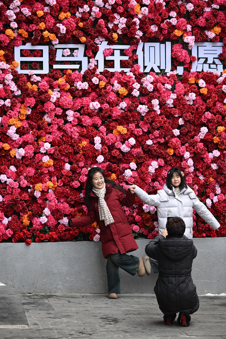 「白馬とバラのクリエイティブ景観壁」が新たなフォトスポットとなり、大勢の他所からの観光客や地元市民が足を止めて記念撮影を楽しんでいる。