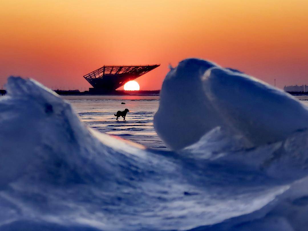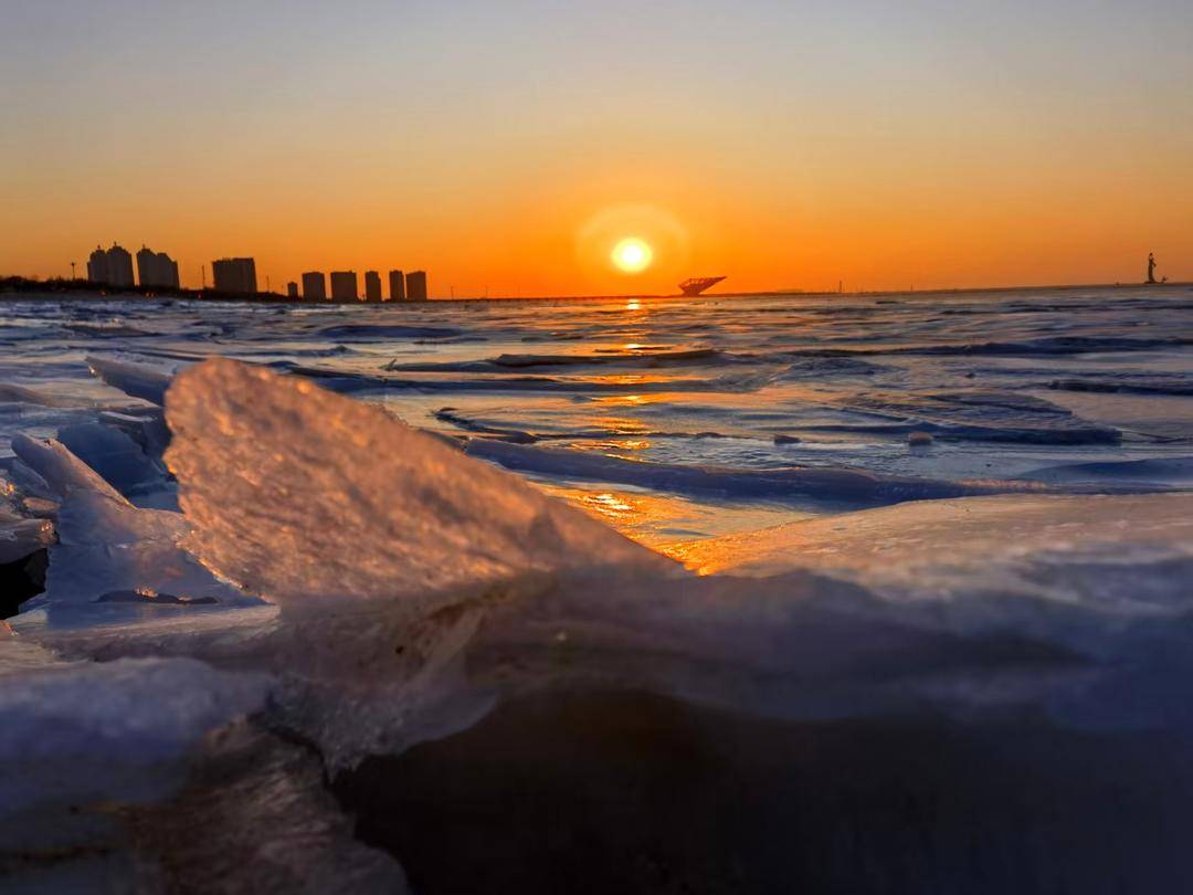 近年、寒波が続く中、冬の営口・鲅魚圏にある金泰城海岸は広大な氷の海と化している。夕日が沈むとき、橙金色の光と深く青い氷の面が交じり合い、北国の冬に極上のロマンスを添えている。遠くには「鲅魚姫」の彫刻と「渤海の真珠」展望台が夕闇の中にはっきりとしたシルエットを描き、柔らかい氷の面と暖かで柔らかな夕焼けとの鮮やかな対照を成している。