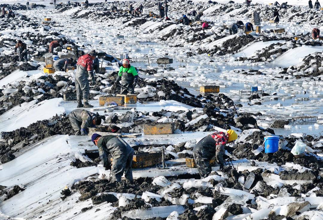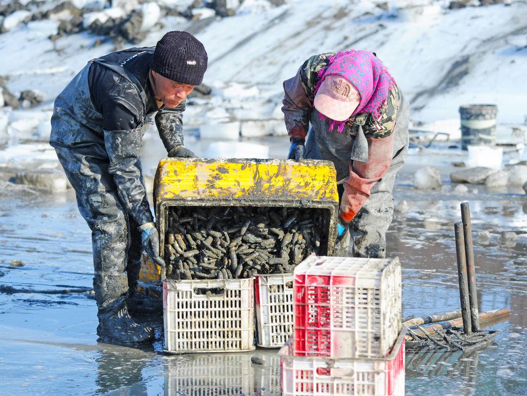 冬の東港と庄河海域の干潟で養殖されるアサリは、最も風味が豊かで美味と言われる。農閑期である冬を利用し、アサリ掘り人たちは氷を割ってアサリを掘り、養殖業者へ販売することで「冬の閑散期を繁忙期に変える」のだ。彼らは厚手の綿入れを身にまとい、厳寒の中、まずはつるはしで硬く凍った海氷を砕き、続いて鋼製の熊手で泥をかき分けアサリを探す。
