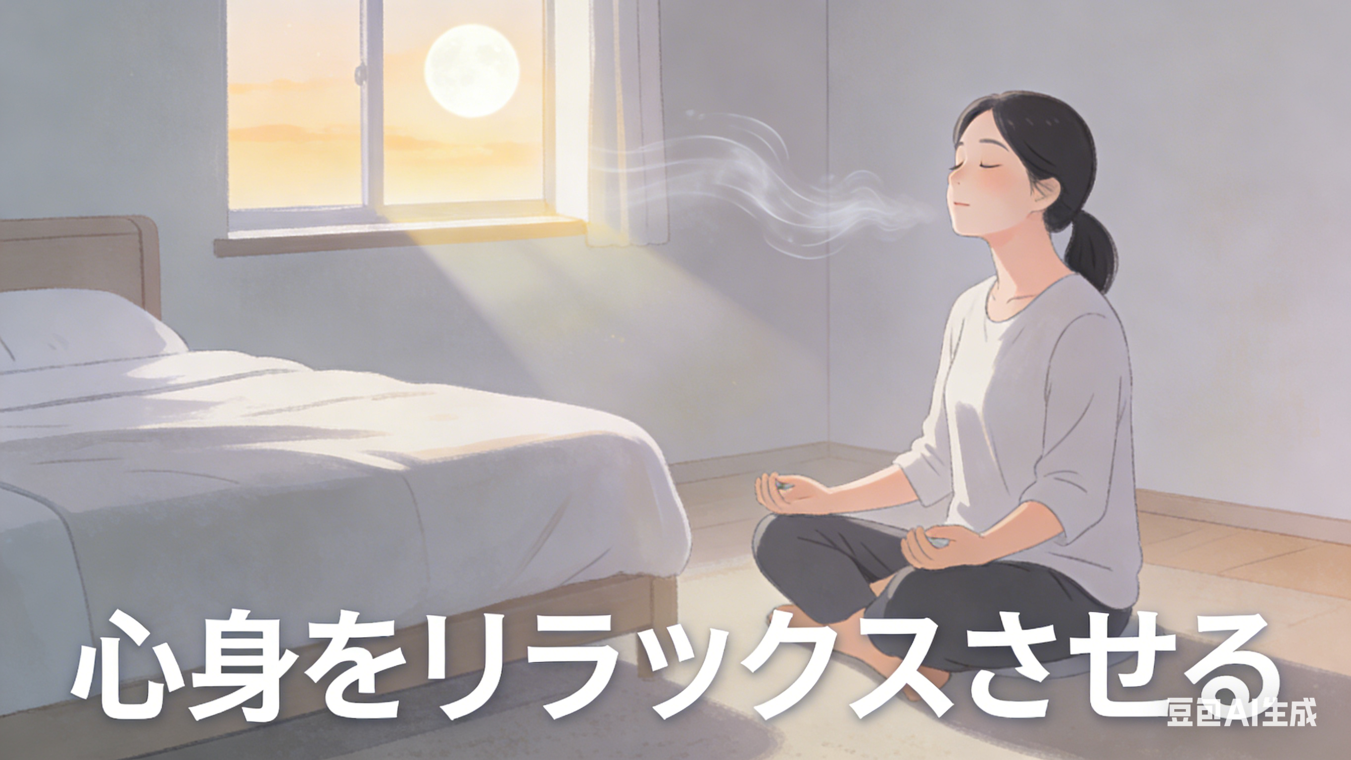 就寝前には、呼吸法や瞑想などを通じて、交感神経の興奮を鎮めることができる。意識を今この瞬間の呼吸に集中させ、鼻から息を吸い、口から息を吐き、体内を流れる空気の感覚に意識を向け、頭の中の雑念を呼吸そのものに収束させる。このようにして大脳皮質の過剰な興奮を鎮め、自然な眠りを促す。