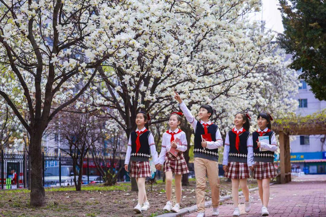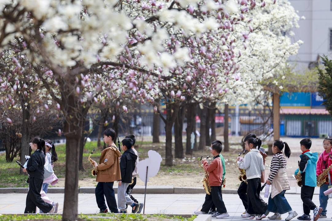 実験小学校の校内では、ハクモクレンが枝いっぱいに咲き誇り、凛とした花の香りがキャンパスに満ちている。授業の終わりを知らせるベルが鳴ると、学び舎の子どもたちが春光を踏みながら教室を飛び出し、花の下で立ち止まる。花を見上げる者、そっと落ち花を拾う者、追いかけっこに興じる者――歓声と笑い声が花の香りと交わり、春の盛景に一層の活気を添えている。