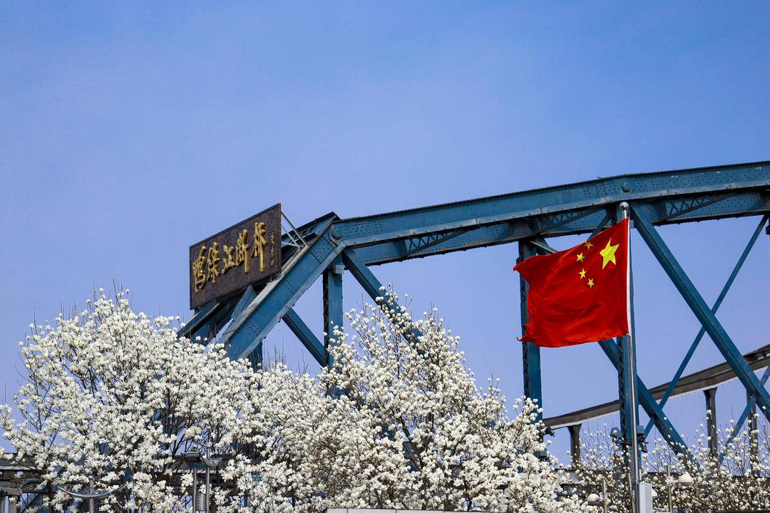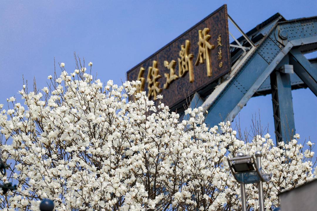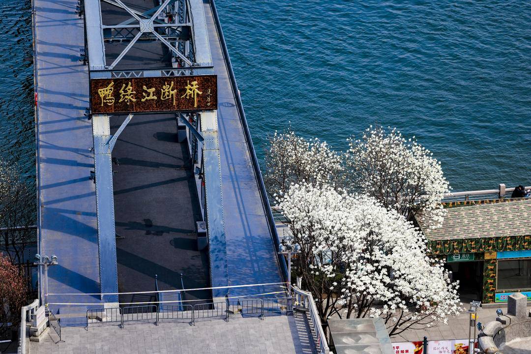 鴨緑江断橋のたもとでは、数本のハクモクレンが川辺に凛と立つ。緑の葉を必要とせず、白く透き通る花びらはしっとりと清らかで、つぼみもあれば、満開に広がるものもある。陽光に柔らかな光沢を帯び、ほのかに清らかな香りを漂わせている。風雪に耐えた断橋は歳月の重みと家国の記憶を刻み、一方の純白のハクモクレンは新たな生命の息吹を感じさせる。歴史の厚みと春の軽やかさが巧みに溶け合い、川風が吹けば花びらがそっと揺れ、せせらぐ江水と共に詩のような景観を織りなし、行き交う人の足を止めさせる。